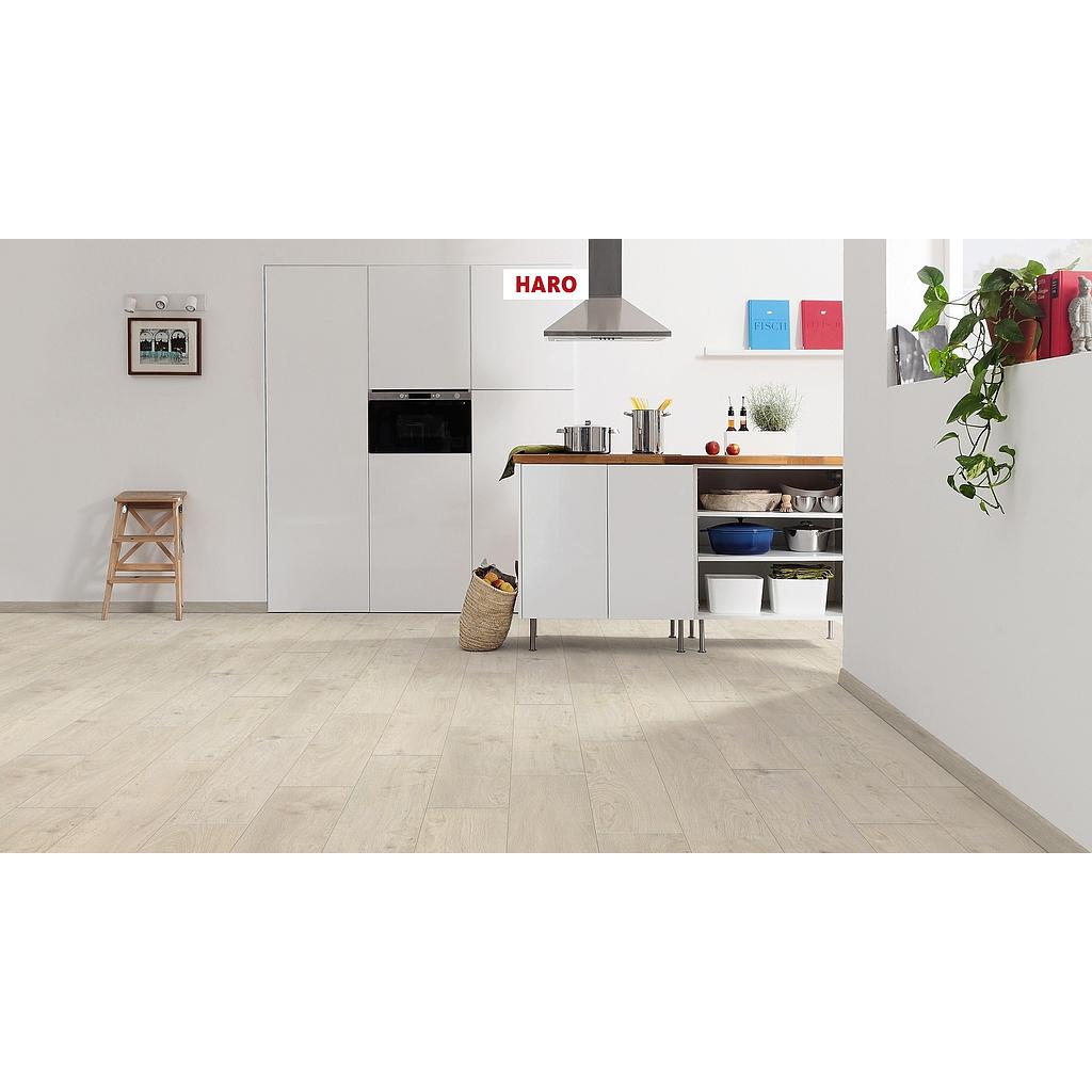 Ce sol stratifié TRITTY 200 Aqua, avec ses planches larges à l'ancienne en Chêne Sicilia blanc, associe résistance, naturel et esthétique.